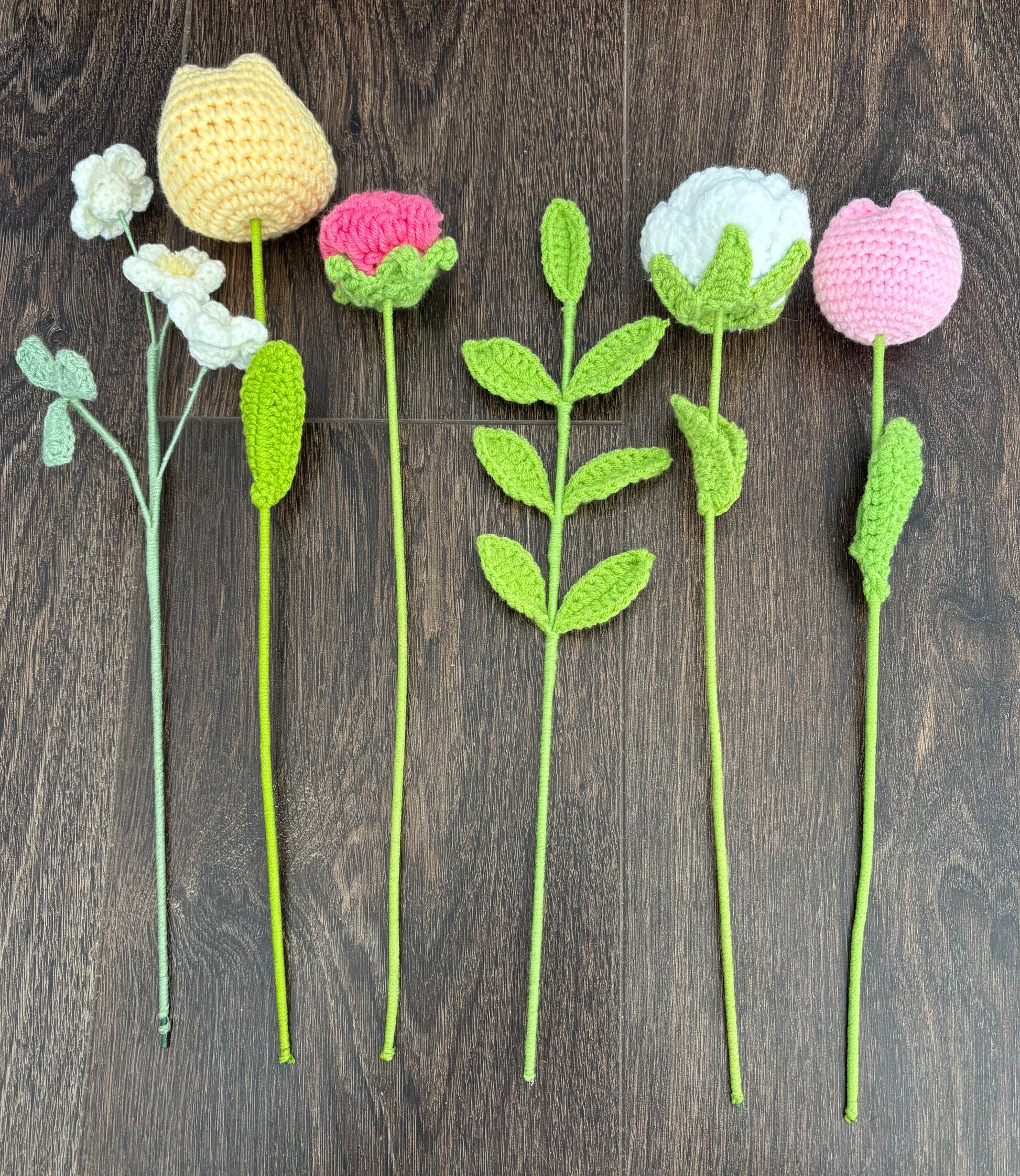 Les fleurs sont faites au crochet avec soin et assemblĂ©es en un joli bouquet durable, qui ne fane jamais đż